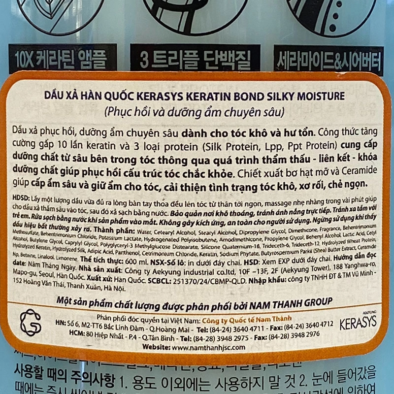 Dầu Xả Kerasys Keratin Dưỡng Ẩm Chuyên Sâu với công thức tăng cường gấp 10 lần Keratin và bộ 3 Protein (Silk, Lpp, Ppt), sản phẩm giúp thẩm thấu, liên kết và khóa dưỡng chất tận sâu bên trong, giúp tóc chắc khỏe và suôn mượt.