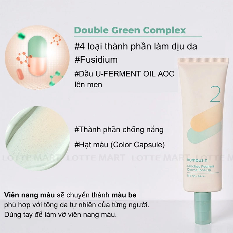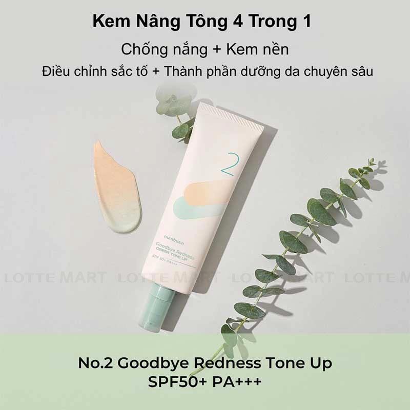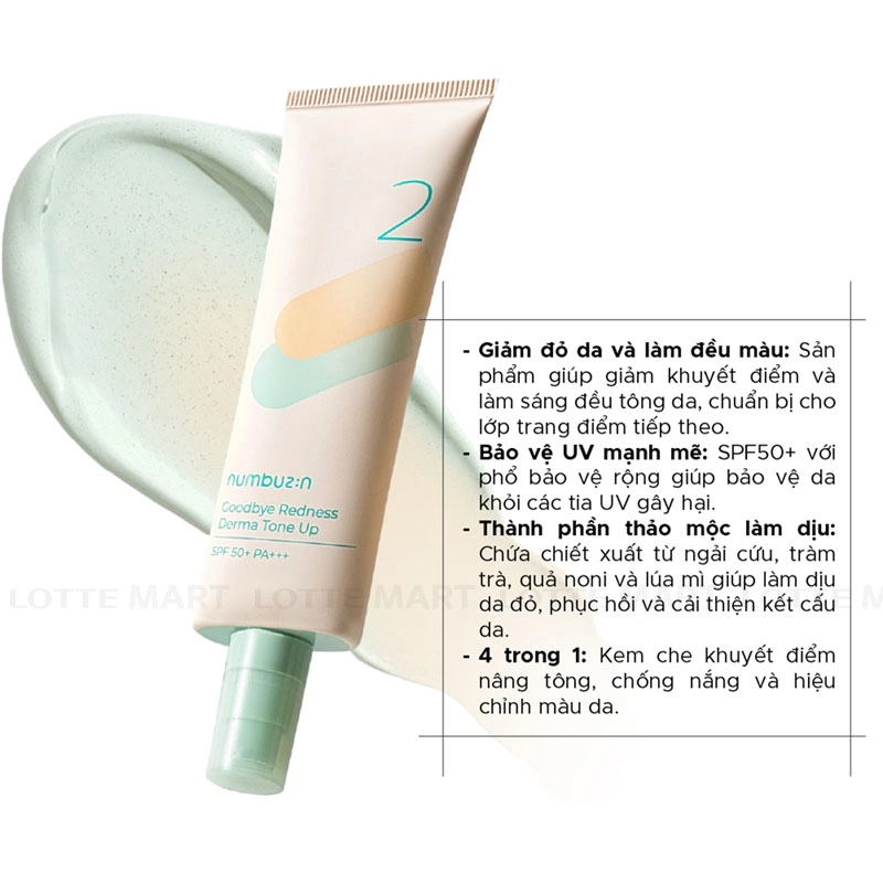- Kem Lót Nâng Tông Hiệu Chỉnh Màu Da Numbuzin No.2 Goodbye Redness Derma Tone Up hỗ trợ làm mờ khuyết điểm và làm đều màu da, chuẩn bị cho các bước trang điểm tiếp theo.