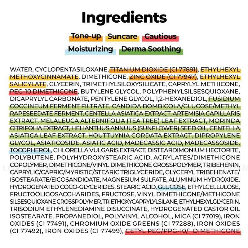 Water, cyclopentasiloxane, titanium dioxide (ci 77891), ethylhexyl methoxycinnamate, dimethicone, zinc oxide (ci 77947), ethylhexyl salicylate, glycerin, trimethylsiloxysilicate, caprylyl methicone, peg-10 dimethicone, butylene glycol, polyphenyl silsesquioxane, dicaprylyl carbonate, pentylene glycol, 1,2-hexanediol, fusidium coccineum ferment filtrate, candida bombicola glucose/methyl rapeseedate ferment, centellaasiatica extract, artemisia capillaris extract, melaleuca alternifolia (tea tree) leaf extract, morinda citrifolia extract, helianthus annuus (sunflower) seed oil, centella asiatica leaf extract, houttuynia cordata extract, dipropylene glycol, asiati coside, asiatic acid, madecassic acid, madecassoside, tocopherol, chlorella vulgaris extract, disteardimonium hectorite, polybutene, polyhydroxystearic acid, acrylates/dimethicone copolymer, dimethiconeninyl dimethicone crosspolymer, tribehenin, caprylic/capric/myristic/stearic triglyceride, glyceryl tribehenate/ isostearate/eicosandioate, magnesium sulfate, aluminum hydroxide, hydrogenated coco-glycerides, stearic acid, glucose, ethylcellulose, fructooligosaccharides, fructose, vinyl dimethicone/methicone silsesquioxane crosspolymer, triethoxycaprylylsilane, ethylhexylglycerin, trisodium ethylenediamine disuccinate, hydrogenated castor oil isostearate, propanediol, polyvinyl alcohol, mica (ci 77019), iron oxides (ci 77491), chromium oxide greens (ci 77288), iron oxides (ci 77492), iron oxides (ci 77499), cetyl peg/ppg-10/1 dimethicone.