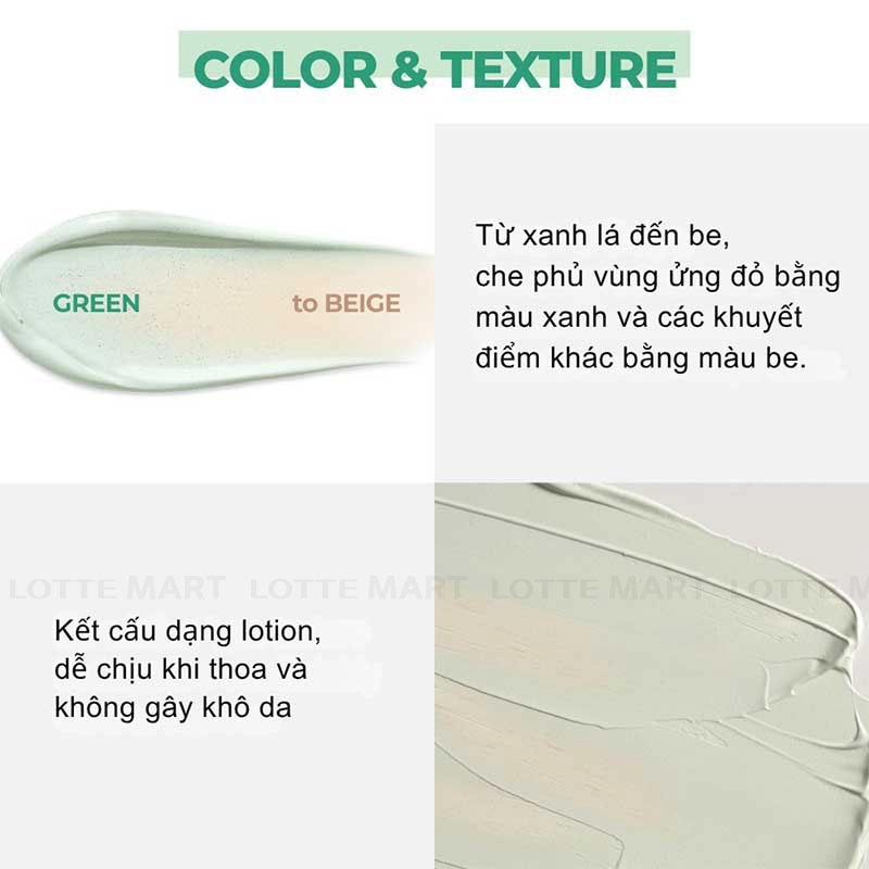 - Chăm sóc tông màu kép với lớp nền màu xanh lá cây đóng vái trò lót và hỗ trợ che phủ các vết đỏ trên da và viên nang màu hiệu chỉnh phù hợp tone da.