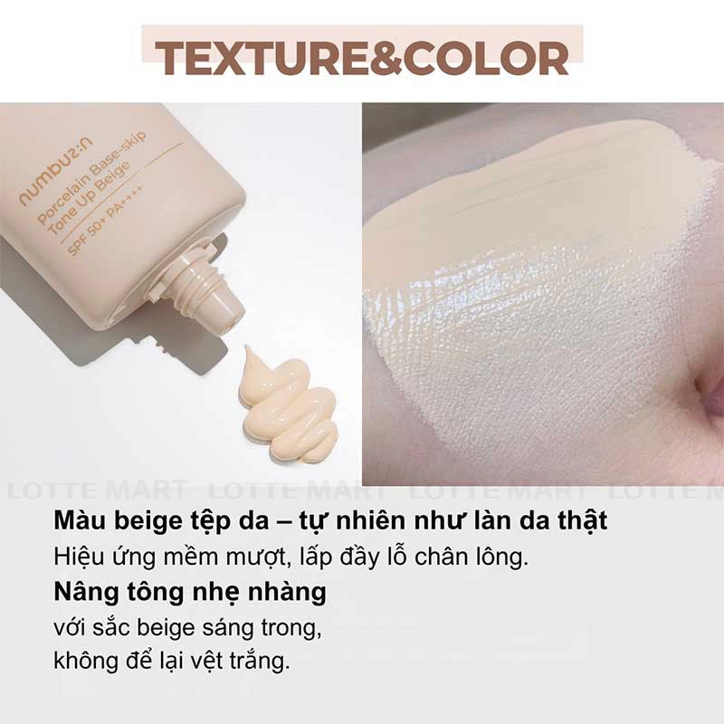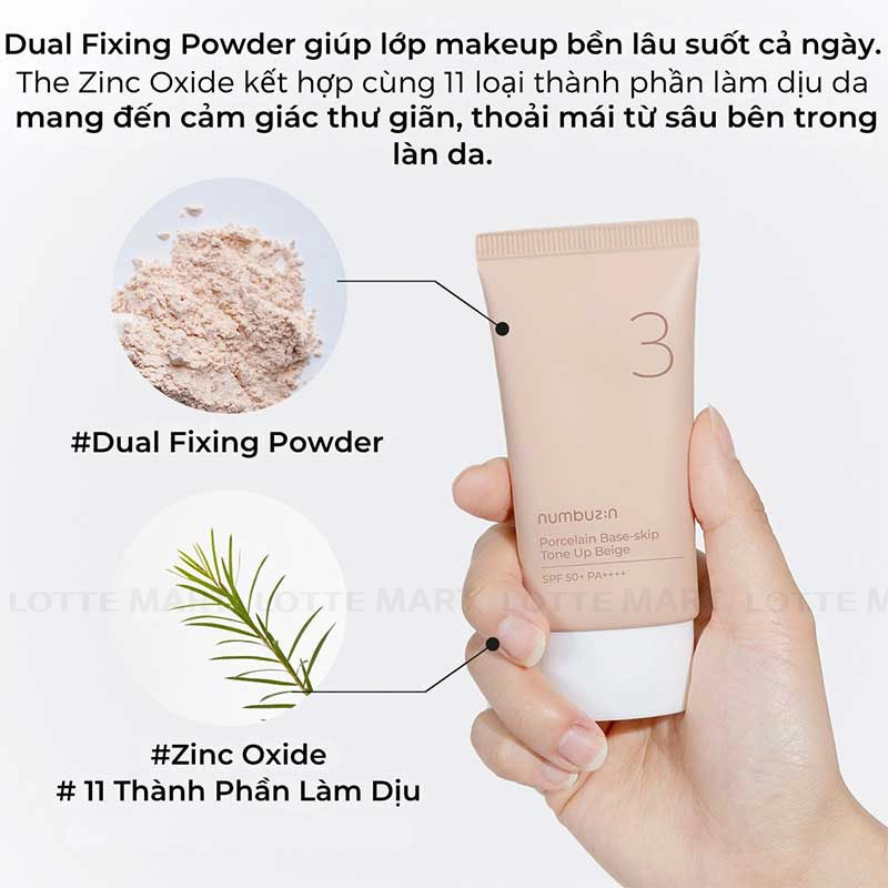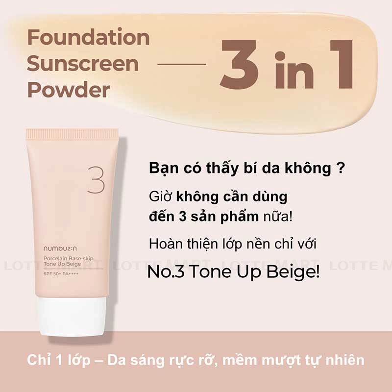 - Kem Chống Nắng Nâng Tone Numbuzin No.3 Porcelain Base-Skip Tone Up Beige SPF50+ PA++++ là kem chống nắng đa chức năng và hiệu quả cao, có nhiều công dụng trong quy trình chăm sóc da và trang điểm của bạn.