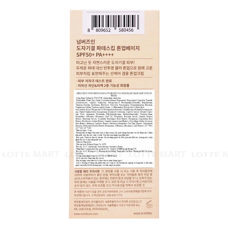 Kem Chống Nắng Nâng Tone Numbuzin No.3 Porcelain Base-Skip Tone Up Beige SPF50+ PA++++
