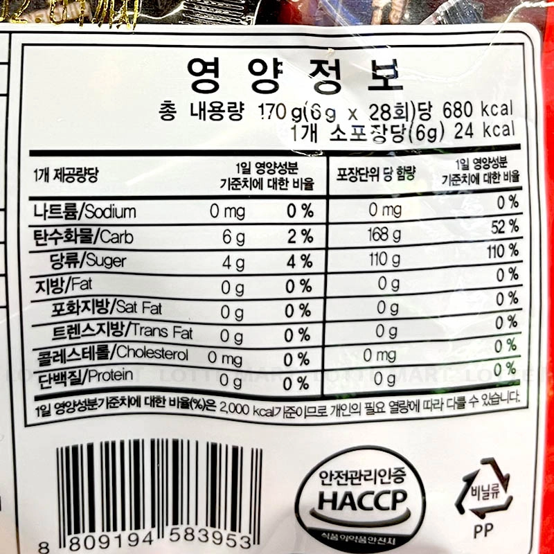 - Đường trắng, mạch nha, hồng sâm cô đặc 0,2% (Hàn Quốc: thành phần rắn 60% trở lên, thành phần hồng sâm 70mg/g trở lên), hương liệu tổng hợp (hương hồng sâm), màu caramel, menthol.