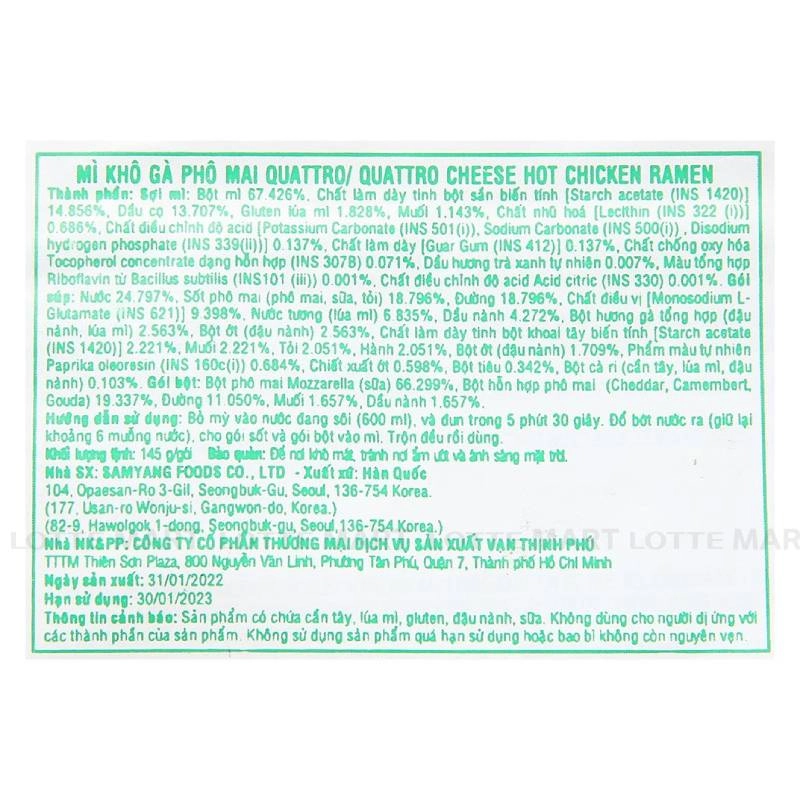 Mì khô gà cay Samyang vị phô mai gói 140g nội địa Hàn Quốc cực hấp dẫn không thể bỏ qua. Mùi thơm phảng phất của phô mai lan tỏa từ bên ngoài đến khắp trong vị giác sau cái gắp đũa đầu tiền hứa hẹn sẽ làm cho ai yêu thích hương vị phô mai sẽ phải thích thú sau lần đầu thưởng thức.