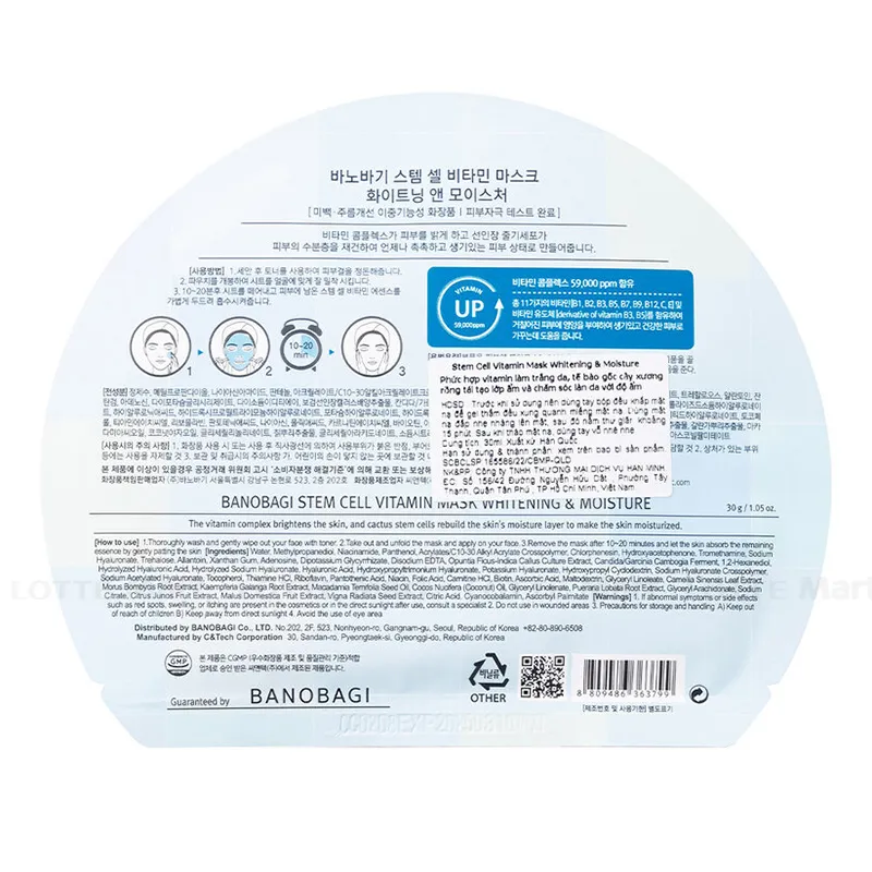 Mặt Nạ Banobagi Dưỡng Sáng Và Cấp Ẩm Whitening & Moisture Gói 30g là phiên bản mới của dòng mặt nạ giấy dưỡng da đình đám từ nhà Banobagi. Chất liệu để làm nên mặt nạ Banobagi Stem Cell Vitamin Mask vẫn là cotton 100% tự nhiên, vô cùng thân thiện với mọi làn da, kể cả da nhạy cảm, da dễ kích ứng. Mặt nạ Banobagi không phải là loại mặt nạ thông thường mà là mặt nạ cung cấp vitamin dạng gel.