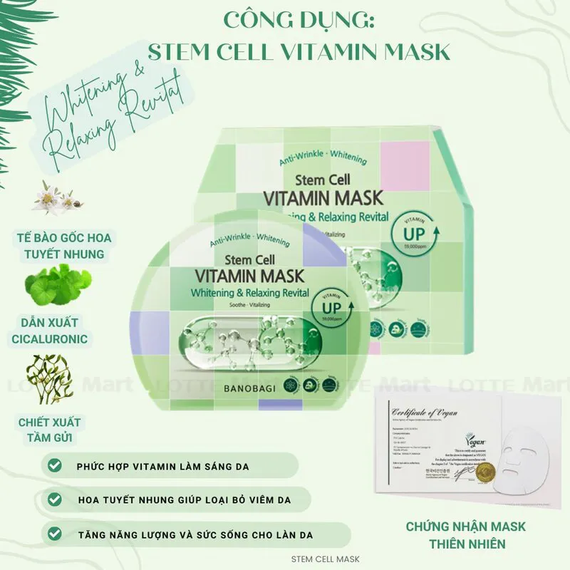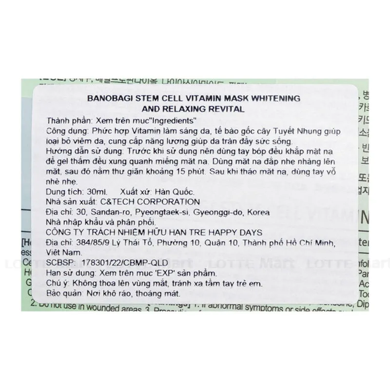 Mặt Nạ Banobagi Dưỡng Sáng Thư Giãn Da Whitening & Relaxing Revital Gói 30g là phiên bản mới của dòng mặt nạ giấy dưỡng da đình đám từ nhà Banobagi. Chất liệu để làm nên mặt nạ Banobagi Stem Cell Vitamin Mask vẫn là cotton 100% tự nhiên, vô cùng thân thiện với mọi làn da, kể cả da nhạy cảm, da dễ kích ứng. Mặt nạ Banobagi không phải là loại mặt nạ thông thường mà là mặt nạ cung cấp vitamin dạng gel.