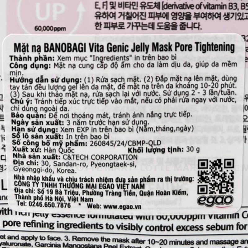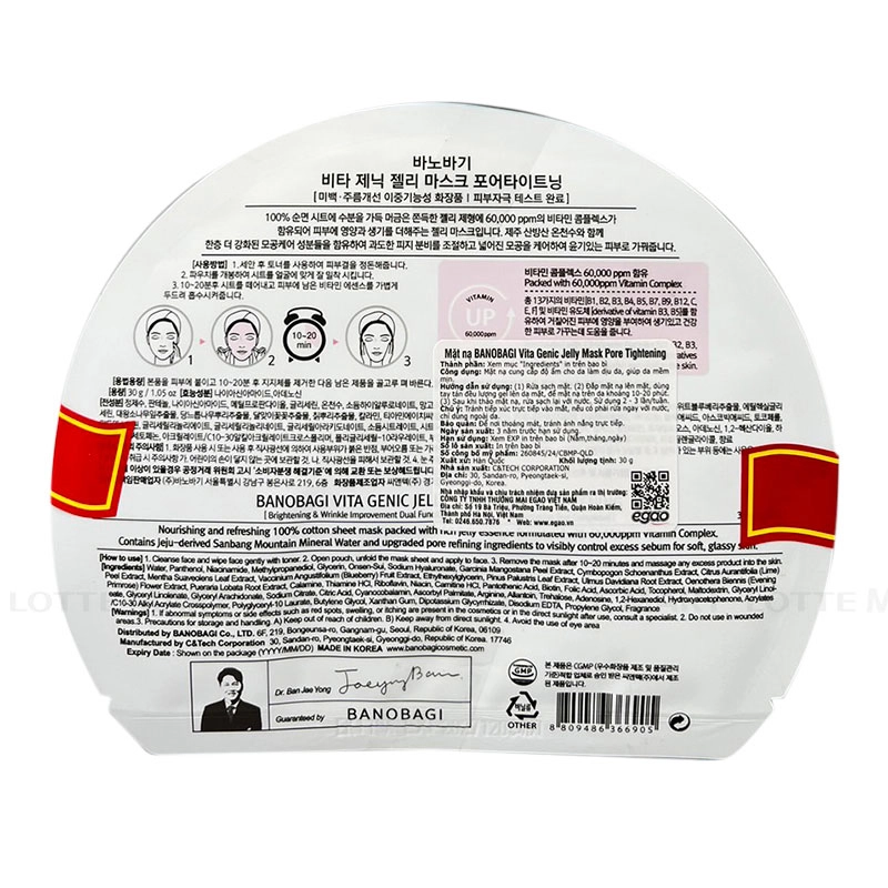 - Mặt Nạ Banobagi Vita Genic Tightening Se Khít Lỗ Chân Lông chứa hàm lượng dưỡng chất lên tới 60.000ppm với thành phần chiết xuất từ suối nước nóng đảo Jeju và phức hợp 13 loại vitamin giúp se khít lỗ chân lông, chống oxy hóa, chống lão hóa và làm dịu da.