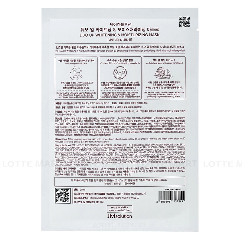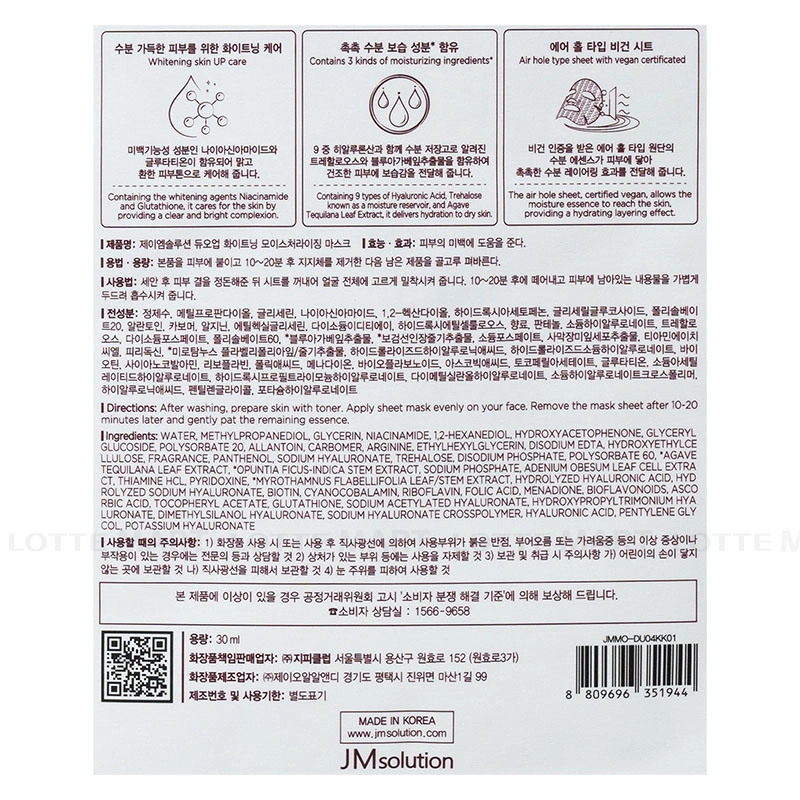 Mặt Nạ Dưỡng Trắng JM Solution Double Whitening And Moisture hỗ trợ cấp ẩm đa tầng với 8 loại Hyaluronic Acid (HA) và Trehalose, giúp da căng mọng, mịn màng và được cấp nước sâu.