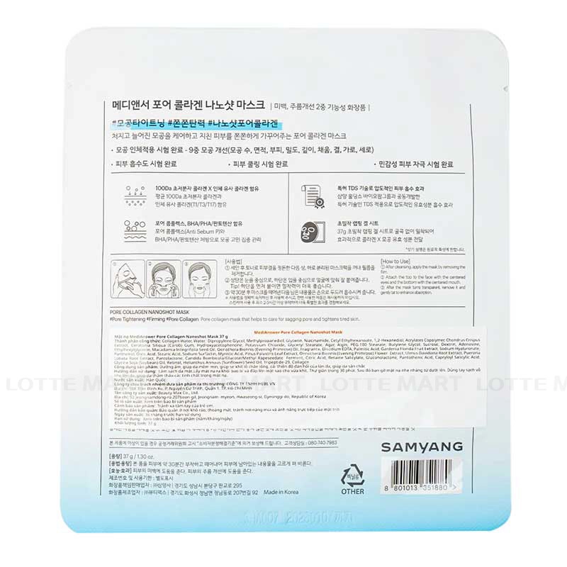 - Mặt Nạ Thạch MediAnswer Pore Collagen NanoShot Mask - Xanh chứa công thức đột phá kết hợp Collagen siêu vi phân tử 100Da và Tripeptide, giúp cải thiện 9 chỉ số lỗ chân lông, từ kích thước, mật độ đến độ đàn hồi.