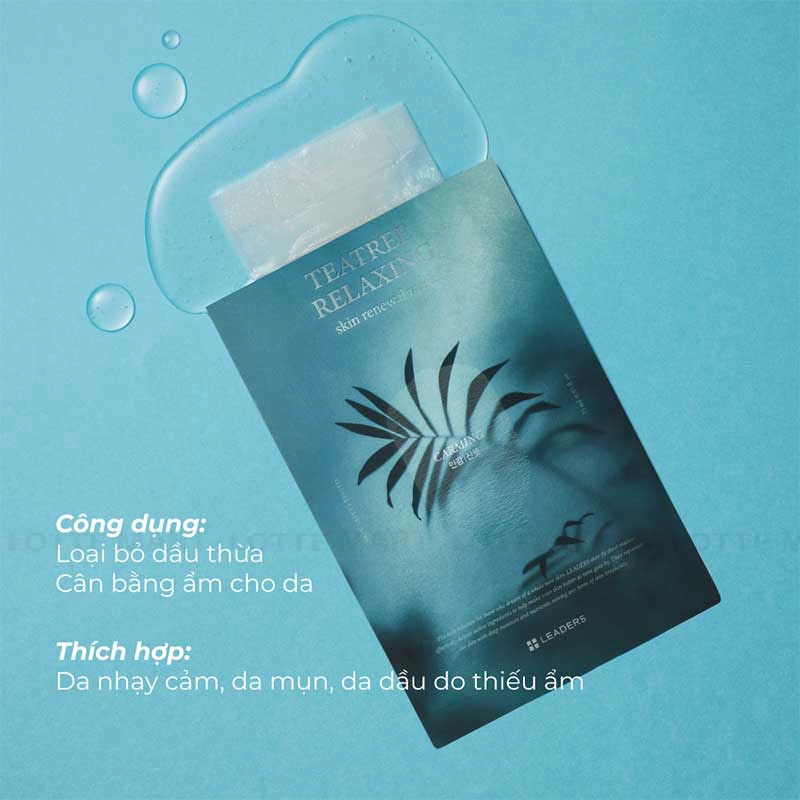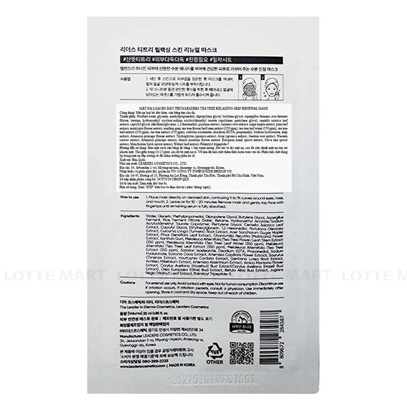 - Mặt Nạ Dưỡng Da Leader Tea Tree Relaxing Skin Renewal 25ml chứa tràm trà, rau má, diếp cá và hoa cúc, giúp giảm đỏ, làm dịu mụn, kiểm soát dầu và phục hồi da hiệu quả.