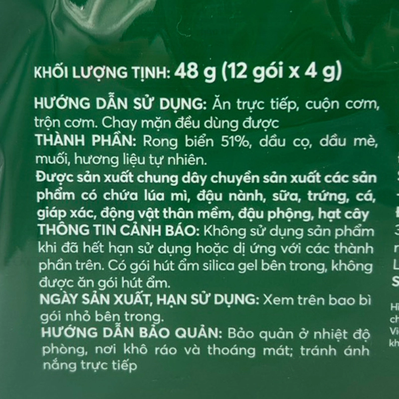 - Rong biển 54%, dầu hướng dương, dầu mè, muối.