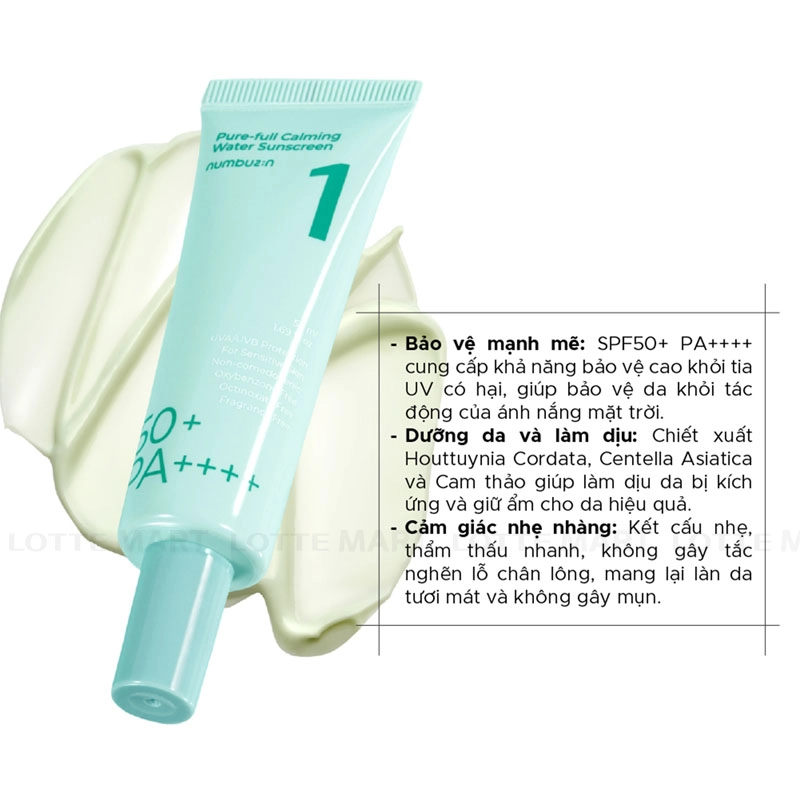 - Kem Chống Nắng Dưỡng Ẩm Numbuzin No.1 SPF 50+ PA++++ sử dụng bộ lọc hóa học để cung cấp khả năng bảo vệ SPF50+ PA++++ chống lại tia nắng mặt trời.