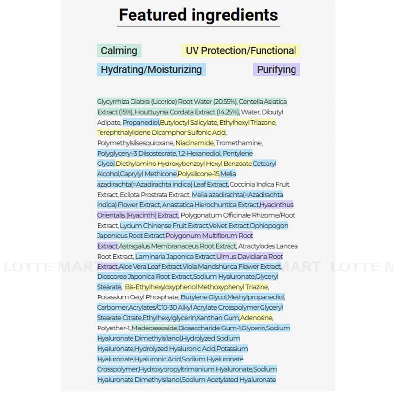 Purified water, licorice root water, dibutyl adipate, propanediol, butyloctyl salicylate, ethylhexyl triazone, terephthalylidene dicamphor sulfonic acid, polymethylsilsesquioxane, 1,2-hexanediol, niacinamide, tromethamine, polyglyceryl-3 distearate, butylene glycol, pentylene glycol, diethylaminohydroxybenzoyl hexyl benzoate, cetearyl alcohol, caprylyl methicone, polysilicone-15, centella asiatica extract, scutellaria baicalensis extract, scutellaria baicalensis leaf extract, ivy gourd fruit extract, rhizome/root extract, wolfberry extract, deer antler extract, lily of the valley leaf extract Root extract, Polygonum multiflorum root extract, Astragali root extract, Kelp extract, Eleutherococcus mume root extract, Mochang root extract, Aloe vera leaf extract, Viola flower extract, Yam root extract, True Rose of Jericho extract, Hyacinthus officinalis extract, Sodium hyaluronate, Glyceryl stearate, Bis-Ethylhexyloxyphenol methoxyphenyl triazine, Potassium cetyl phosphate, Methylpropanediol, Carbomer, Acrylate/C10-30 Alkyl Acrylate Crosspolymer, Glyceryl stearate citrate, Ethylhexylglycerin, Xanthan gum, Adenosine, Polyether-1, Madecassoside, Biosaccharide gum-1, Tocopherol, Glycerin, Dimethylsilanol hyaluronate, Hydrolyzed Sodium Hyaluronate, Hydrolyzed Hyaluronic Acid, Potassium Hyaluronate, Hyaluronic Acid, Sodium Hyaluronate Crosspolymer, Hydroxypropyltrimonium Hyaluronate, Sodium Hyaluronate Dimethylsilanol, Sodium Acetylated Hyaluronate.