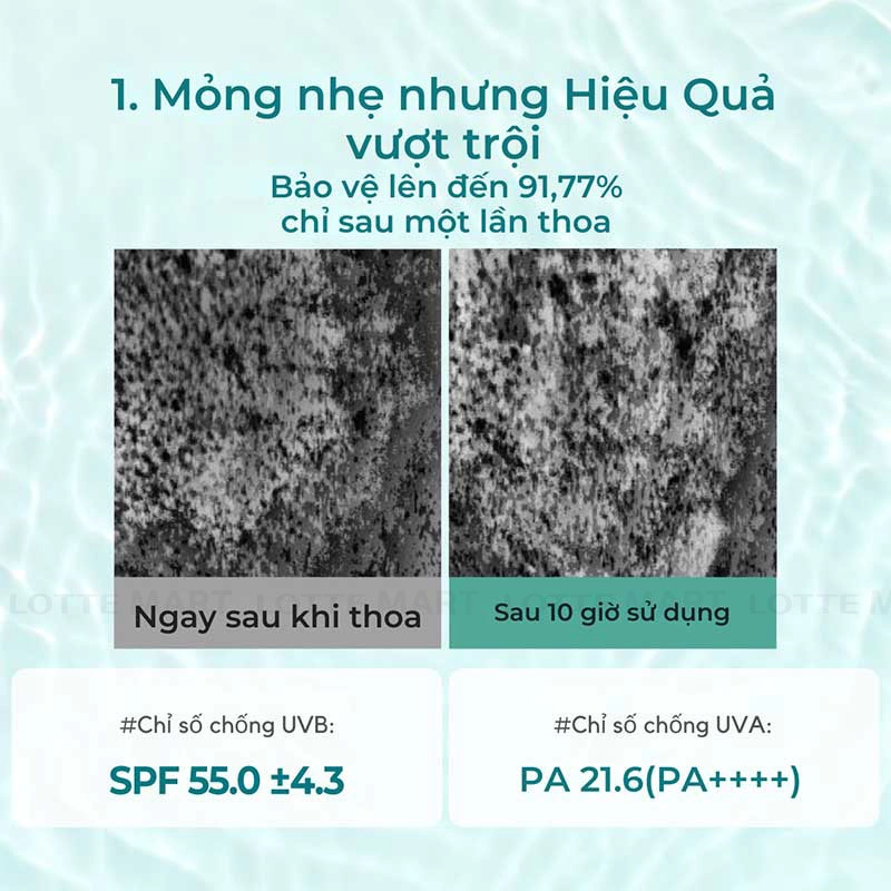 - Chỉ số chống nắng phổ rộng SPF50+ PA++++ giúp bảo vệ da khỏi tia UV có hại.