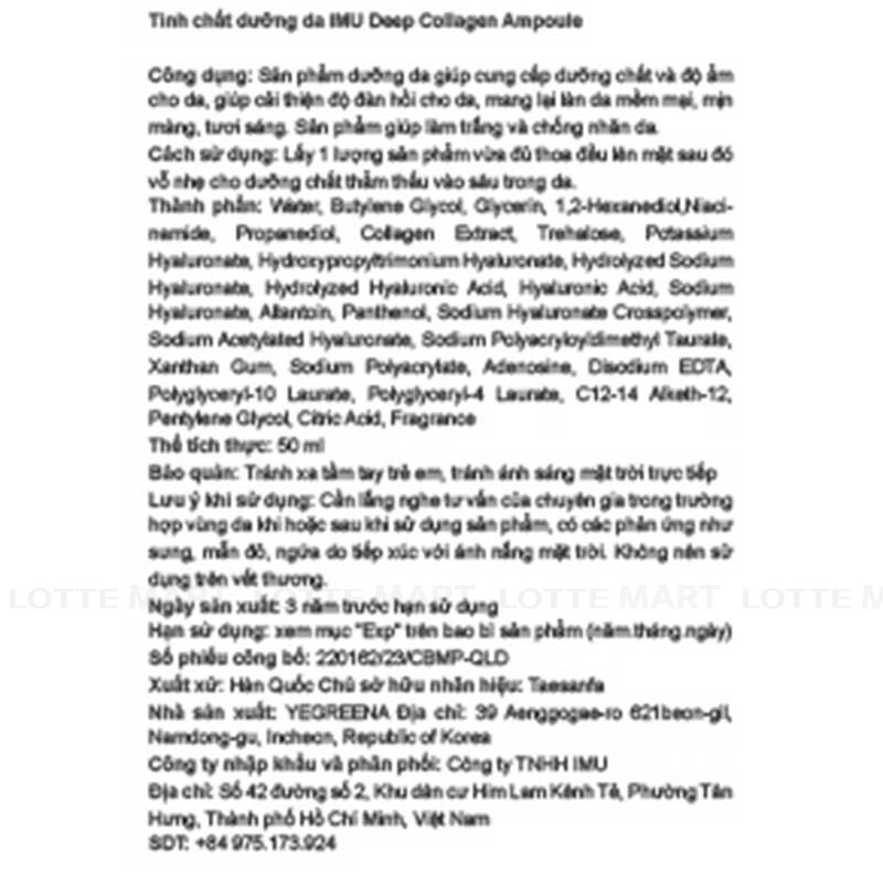 - Serum Dưỡng Da IMU Deep Collagen 50ml giúp cung cấp dưỡng chất và độ ẩm cho da, giúp cải thiện độ đàn hồi cho da, mang lại làn da mềm mại, mịn màng, tươi sáng.
