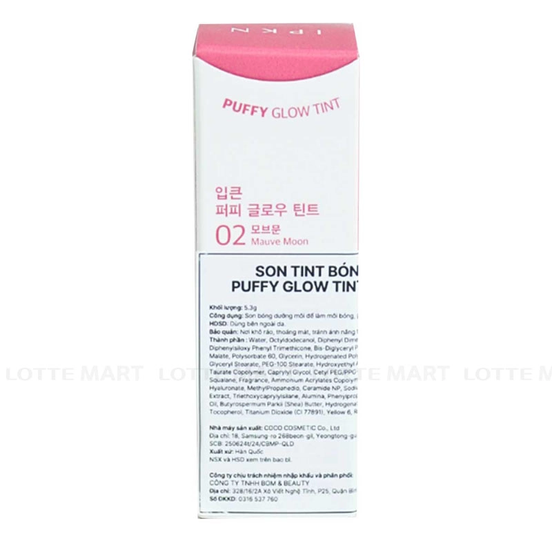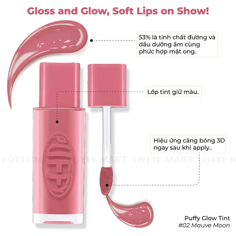- Son Tint Bóng IPKN Puffy Glow Tint #02 Mauve Moon kết cấu dạng jelly, chứa đến 53% serum dưỡng ẩm, kết hợp Ceramide NP, mật ong và chiết xuất thực vật thiên nhiên giúp môi luôn mềm mịn, căng bóng tự nhiên.