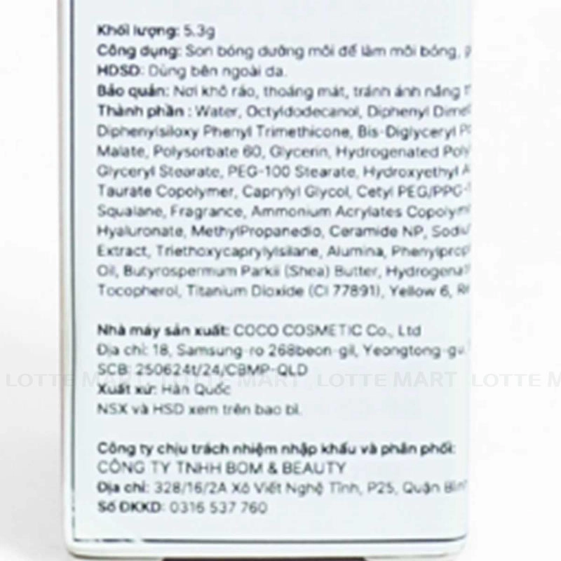 - 3 công năng vượt trội: Tạo hiệu ứng môi căng bóng tự nhiên, rạng rỡ như phủ lớp nước; Dưỡng ẩm và nuôi dưỡng môi mềm mại suốt ngày dài; Che khuyết điểm môi nhẹ nhàng và lên màu tint bền màu, không lo trôi ngay cả khi ăn nhẹ.