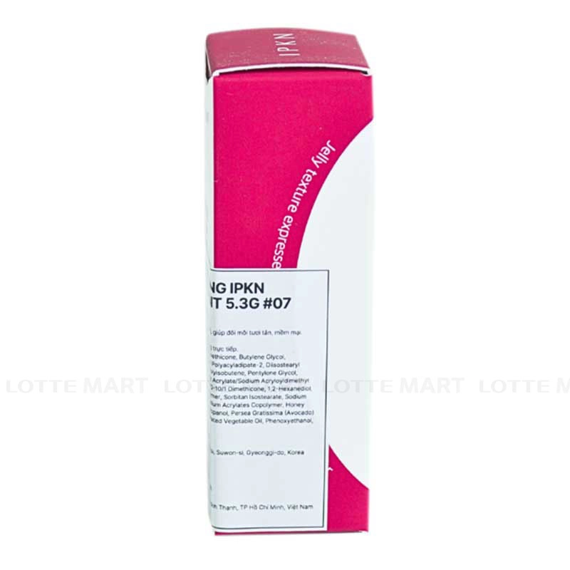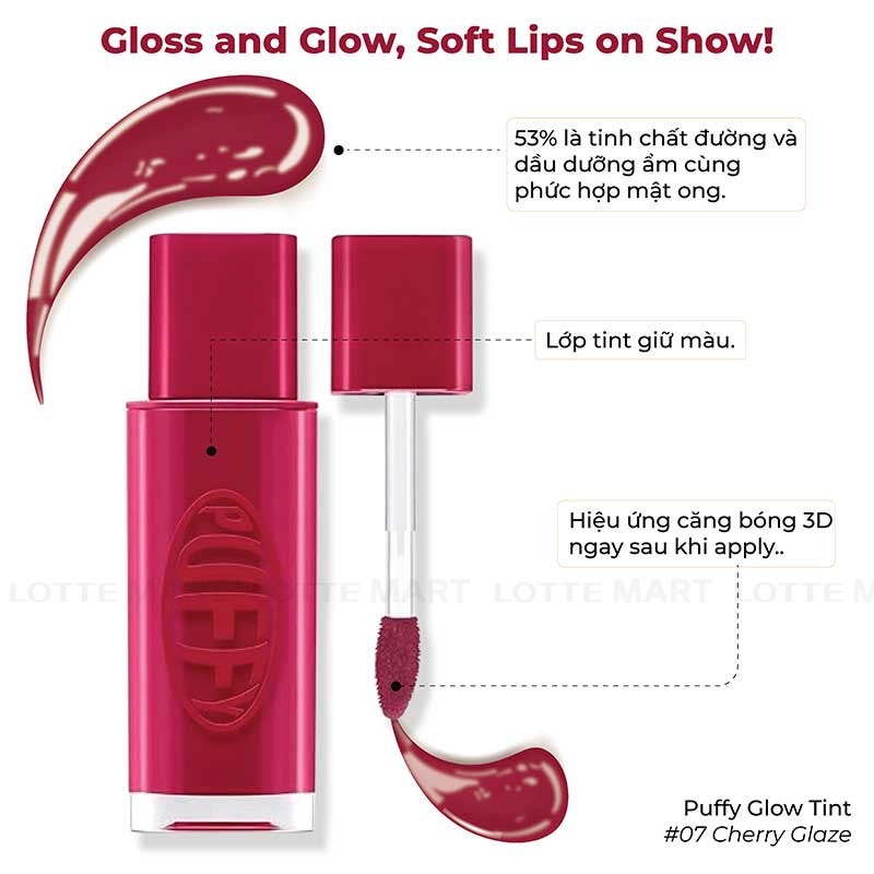 - Son Tint Bóng IPKN Puffy Glow Tint #07 Chery Glaze kết cấu dạng jelly, chứa đến 53% serum dưỡng ẩm, kết hợp Ceramide NP, mật ong và chiết xuất thực vật thiên nhiên giúp môi luôn mềm mịn, căng bóng tự nhiên.