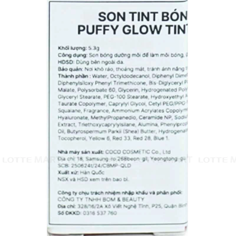 - 3 công năng vượt trội: Tạo hiệu ứng môi căng bóng tự nhiên, rạng rỡ như phủ lớp nước; Dưỡng ẩm và nuôi dưỡng môi mềm mại suốt ngày dài; Che khuyết điểm môi nhẹ nhàng và lên màu tint bền màu, không lo trôi ngay cả khi ăn nhẹ.