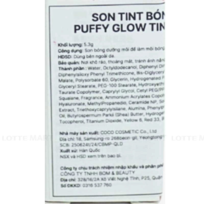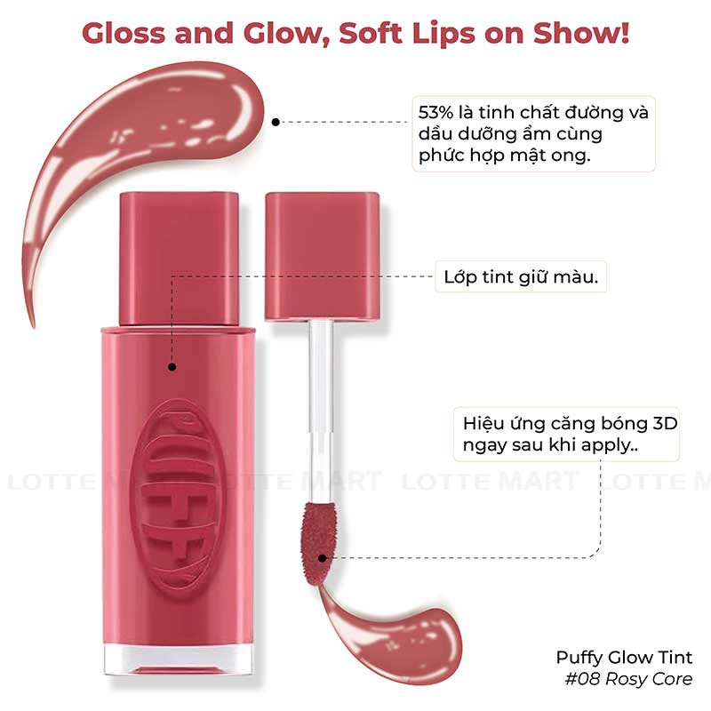- Son Tint Bóng IPKN Puffy Glow Tint #08 Rosy Core kết cấu dạng jelly, chứa đến 53% serum dưỡng ẩm, kết hợp Ceramide NP, mật ong và chiết xuất thực vật thiên nhiên giúp môi luôn mềm mịn, căng bóng tự nhiên.