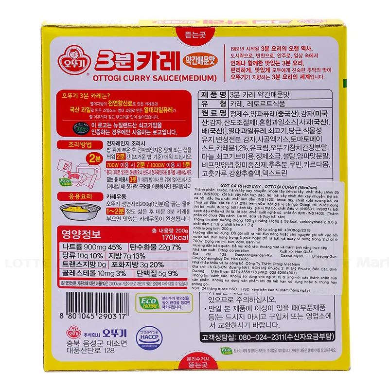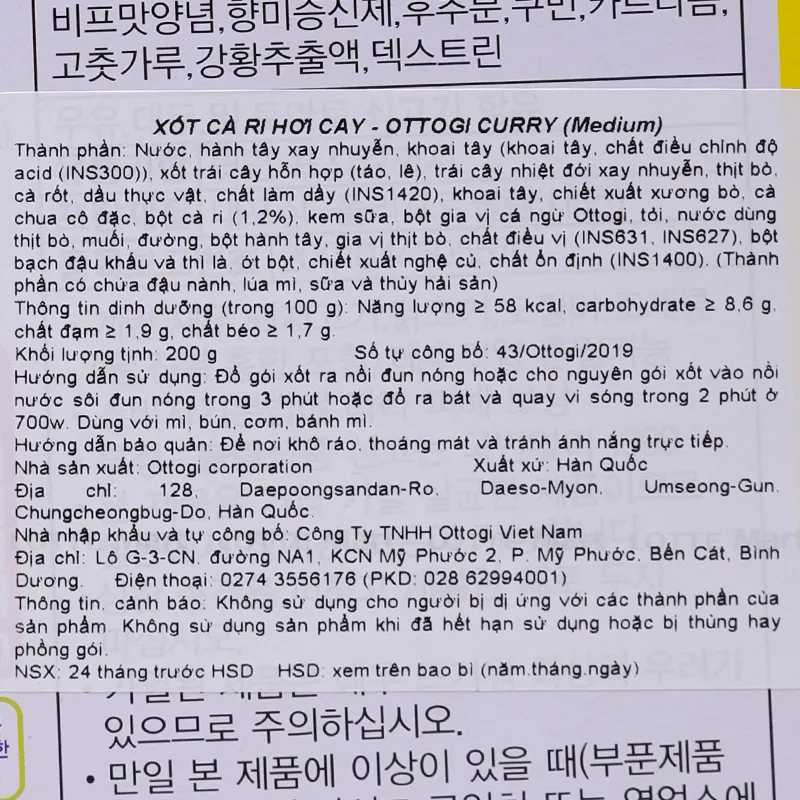 Sốt Cà Ri Cay Vừa Ottogi Hộp 200G được làm từ thành phần tự nhiên: hành tây, cà rốt, khoai tây, bột cà ri, thịt bò, kem sữa, nước táo, bí đỏ, muối, cà chua cô đặc, ngô, bột gạo, gia vị cay và một số thành phần khác, an toàn khi sử dụng. Với gói Sốt cà ri cay Ottogi này bạn có thể ăn với cơm hoặc mì, mang đến cho bạn cảm giác ngon miệng khi thưởng thức.