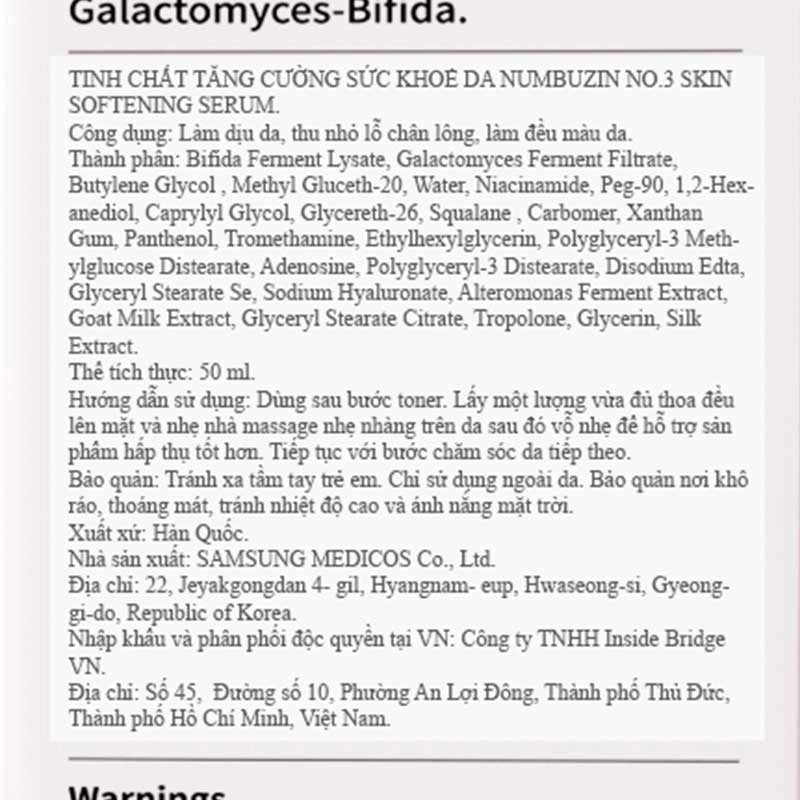 - Tinh Chất Thu Nhỏ Lỗ Chân Lông Numbuzin No.3 Skin Softening Serum có thành phần chứa 42% Bifida Ferment Lysate: Thành phần lên men cải thiện bề mặt da hiệu quả, giúp làm sáng da, tăng cường sức khỏe làn da, da ít bị mẩn đỏ, kích ứng và hạn chế mụn sưng viêm.