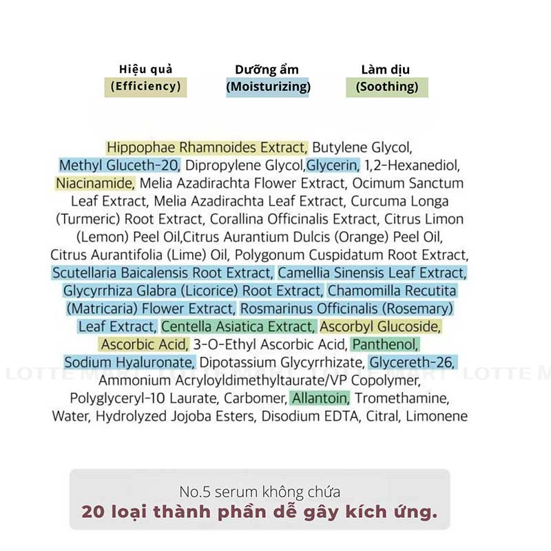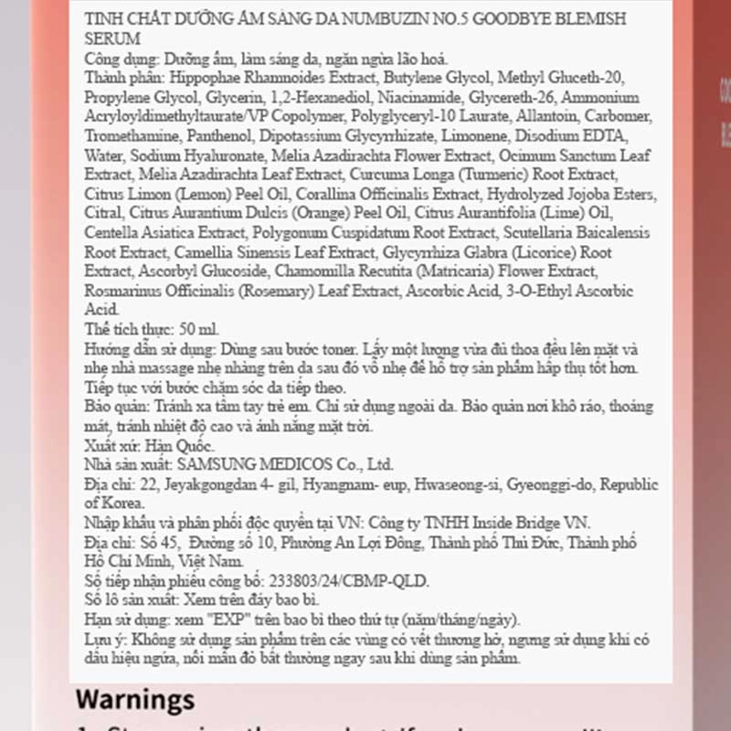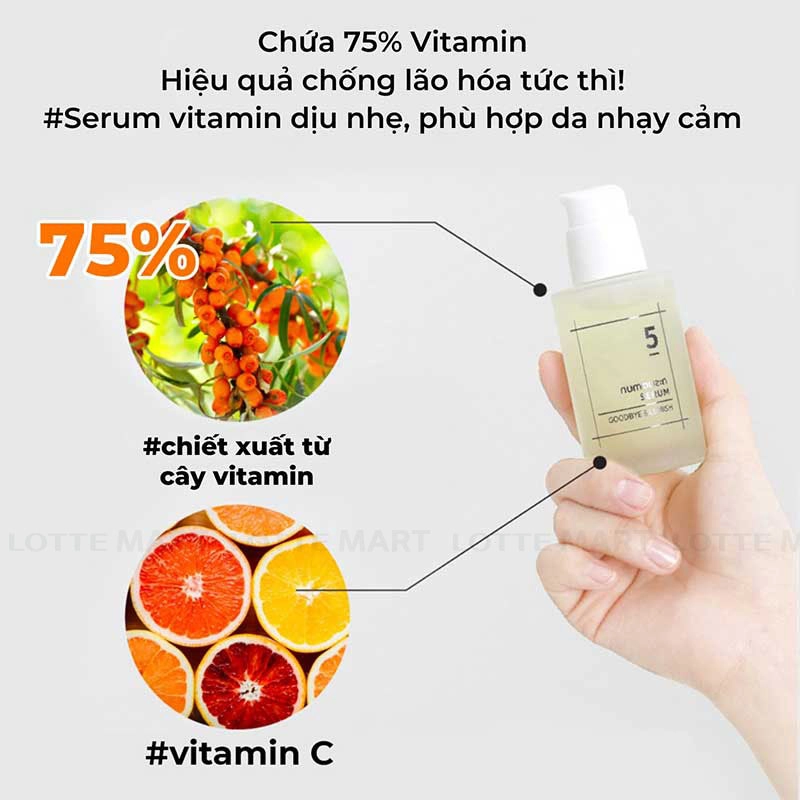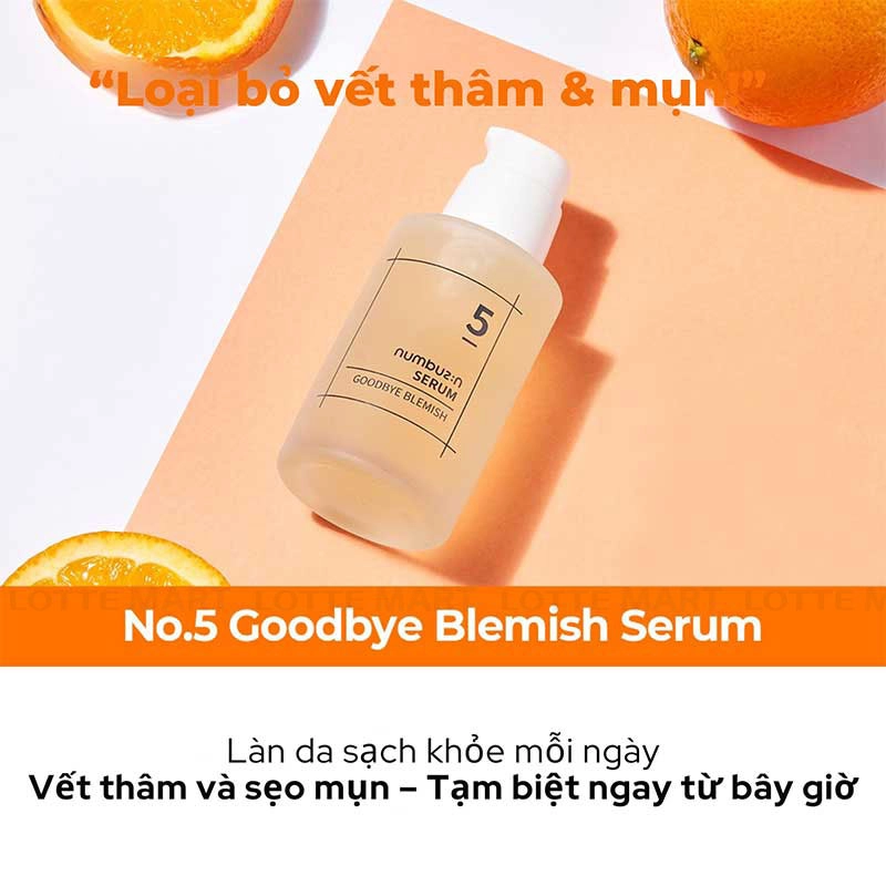 - Tinh Chất Sáng Da Numbuzin No.5 Goodbye Blemish Serum giúp làm sáng và đều màu da. Thành phần chứa vitamin C và chiết xuất hắc mai biển, giúp giảm sắc tố, làm giảm các đốm đen và cải thiện độ rạng rỡ tổng thể của da.