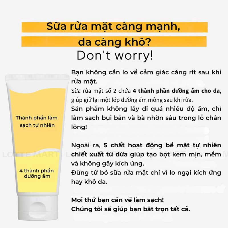 - Chất hoạt động bề mặt có nguồn gốc từ dừa và các thành phần dưỡng ẩm như glycerin để làm sạch nhẹ nhàng mà không làm mất đi độ ẩm của da.
