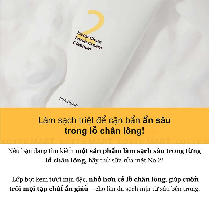 - Kem Rửa Mặt Numbuzin Làm Sạch Sâu No.2 Deep Clean Fresh Cream Cleanser là sản phẩm rửa mặt dạng bọt kem dịu nhẹ được làm từ các thành phần tự nhiên, làm sạch sâu lỗ chân lông khỏi tạp chất và mụn đầu đen, loại bỏ lớp trang điểm và dầu thừa mà không làm khô hoặc kích ứng da.