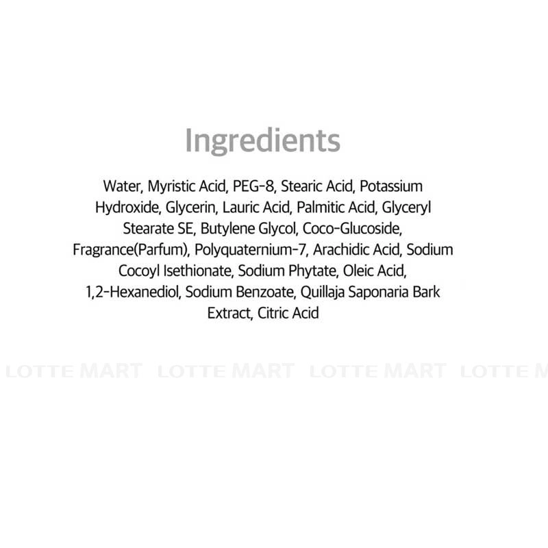 Water, Myristic Acid, PEG-8, Stearic Acid, Potassium Hydroxide, Glycerin, Lauric Acid, Palmitic Acid, Quillaja Saponaria Bark Extract, Butylene Glycol, Coco-glucoside, Glyceryl Stearate SE, Polyquaternium-7, Arachidic Acid, Sodium Cocoyl Isethionate, Sodium Phytate, Oleic Acid, 1,2-Hexanediol, Citric Acid, Sodium Benzoate, Fragrance.