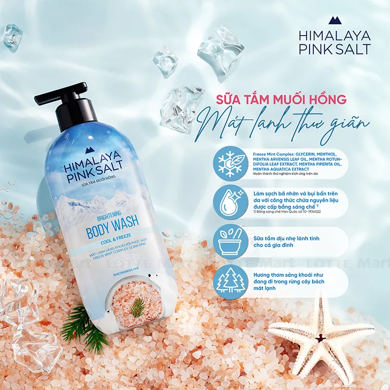 - Sữa Tắm Muối Hồng Himalaya Pink Salt Mát Lạnh Và Thư Giãn cho cả gia đình giúp da mịn màng và ẩm mượt mà không gây kích ứng với lượng bọt dồi dào chứa muối hồng Himalaya và các thành phần chăm sóc da đã được cấp bằng sáng chế