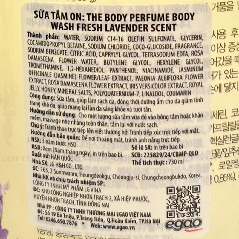 - Sữa Tắm On The Body Hương Lavender là dòng sữa tắm đến từ thương hiệu chăm sóc da On: The Body (thuộc tập đoàn LG của Hàn Quốc) giúp nhẹ nhàng làm sạch cơ thể, lấy đi bụi bẩn, bã nhờn trên da, mang lại độ ẩm mịn màng tránh để làn da khô ráp, nứt nẻ.