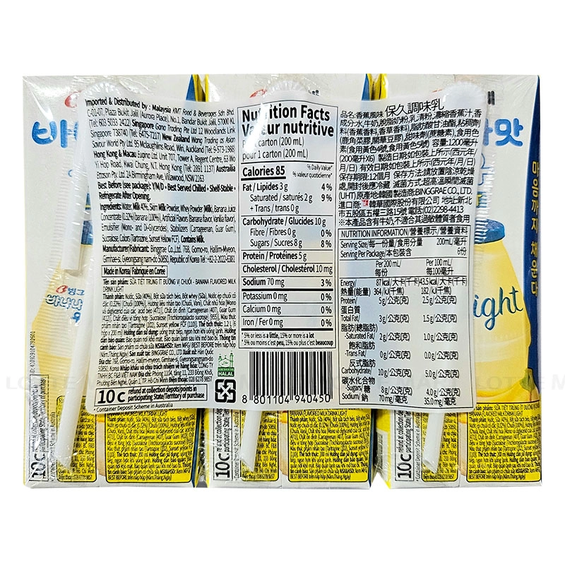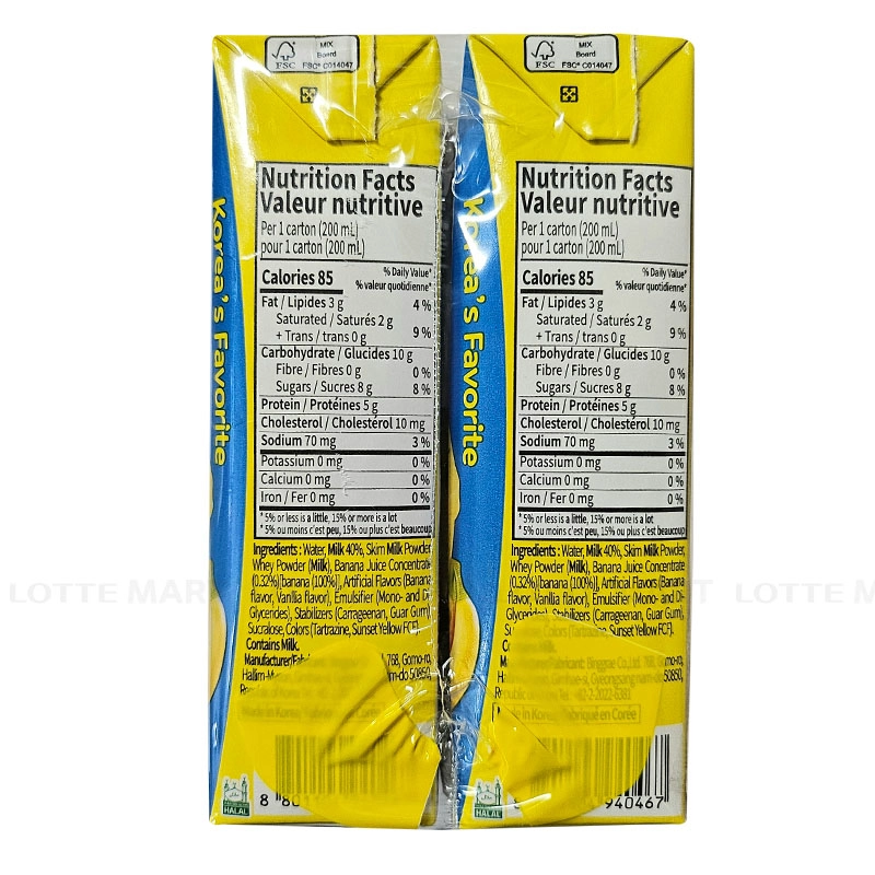 - Nước, Sữa (40%), Bột sữa tách béo pha chế [Bột sữa tách béo, Váng sữa Whey khử khoáng (Sữa)], Nước ép chuối cô đặc (0.32%), Hương liệu nhân tạo (Hương liệu chuối, hương liệu Vani, Lúa mì), Chất ổn định [Mono và diglycerid của các acid béo (E471), Carrageenan (E407), Guar Gum (E412)], Chất điều vị tổng hợp [Sucralose (Trichlorogalacto sucrose) (E955)], Phẩm màu nhân tạo [Tartrazin (E102), Sunset yellow FCF (E110)]. Có chứa sữa và lúa mì.
