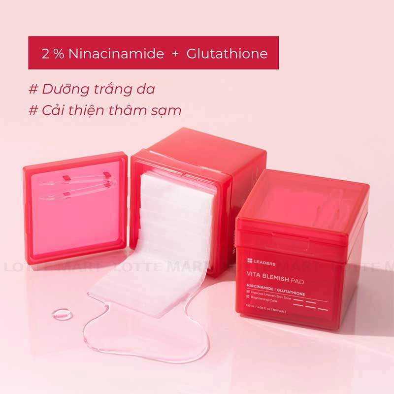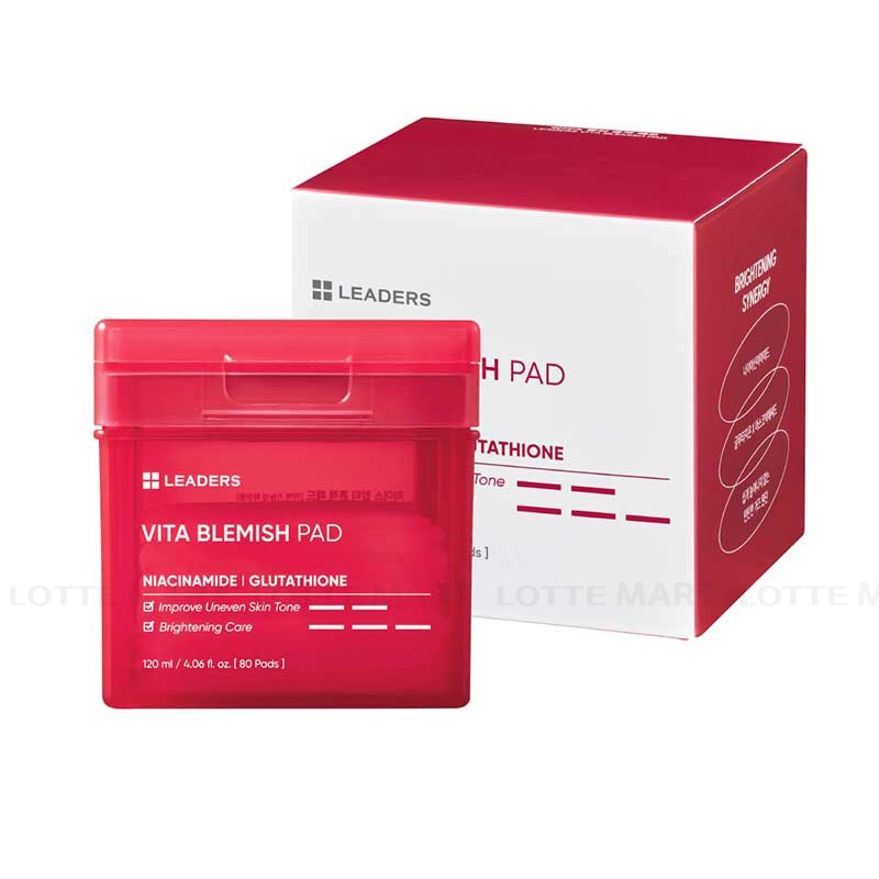 Toner Pad Dưỡng Trắng Làm Đều Màu Da Leaders Vita Blemish Pad Hộp 80 Miếng – Làm sáng & đều màu da. Miếng pad dưỡng sáng da chứa niacinamide, glutathione và vitamin C, giúp giảm thâm, làm sáng da và cải thiện độ đều màu.