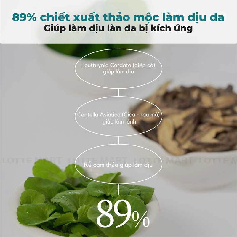 - Chiết xuất thảo mộc xanh (rau má, diếp cá, cam thảo) làm dịu da, ức chế khuẩn mụn, giúp giảm kích ứng, mẩn đỏ.