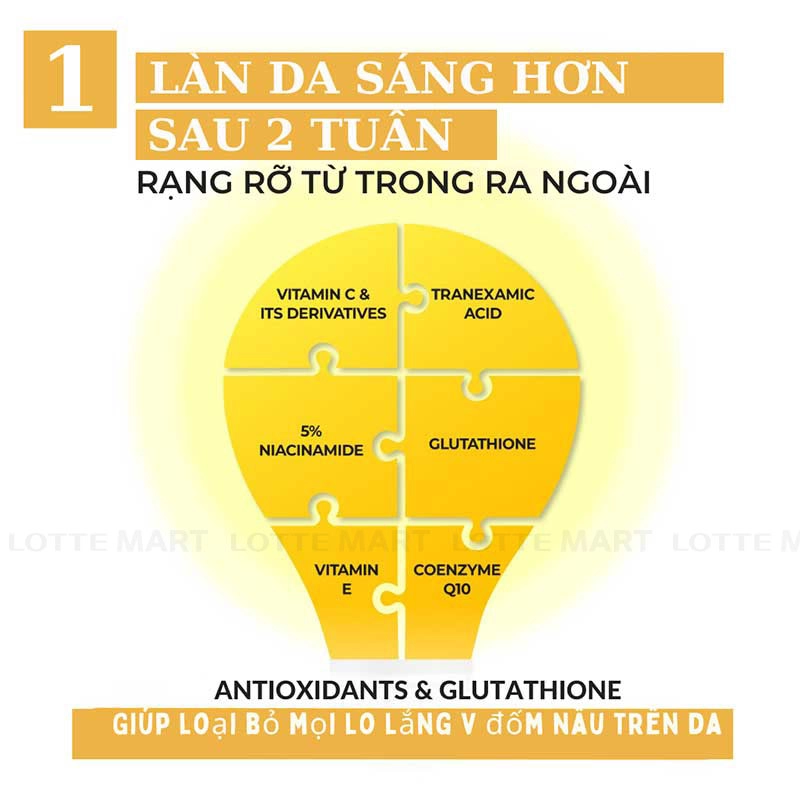 - Công thức chứa hỗn hợp chất chống oxy hóa mạnh gồm 99% glutathione tinh khiết, axit tranexamic và 5% niacinamide, mang lại hiệu quả chăm sóc làm sáng chuyên sâu.