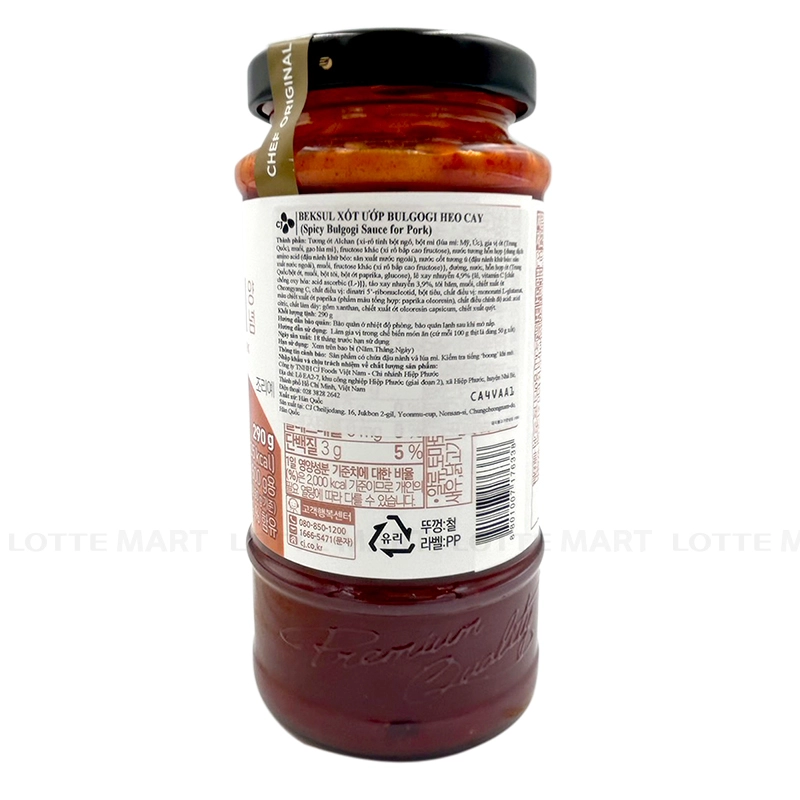 Xốt Ướp Thịt Heo Bulgogi Beksul Hũ 290G giúp bạn tiết kiệm thời gian nấu nướng mà vẫn có được hương vị thịt nướng đặc trưng của người Hàn. Thành phần: Tương ớt, xi rô bắp giàu fructose, nước tương, đường, nước, hỗn hợp bột ớt, lê nghiền nhuyễn 5%, táo nghiền nguyễn 4%, tỏi băm, muối, rượu gạo dùng trong nấu ăn, chiết xuất ớt xanh, chất điều vị, bột hạt tiêu đen...Hướng dẫn sử dụng: Chuẩn bị 600g thịt, 160g nước sốt, hành tây, hành lá. Ướp thịt với nước sốt trong 30 phút. Thái nhỏ rau, trộn với thịt đã ướp, sau đó nướng. Bảo quản: Để nơi khô ráo, thoáng mát, tránh ánh nắng trực tiếp. Bảo quản trong ngăn mát tủ lạnh nếu không dùng hết.