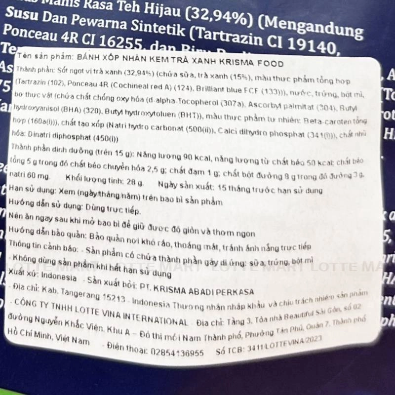 - Bánh Xốp Krisma Food Nhân Kem Trà Xanh là sản phẩm bánh chất lượng đến từ Indonesia. Đây là một món ăn vặt hấp dẫn, mang đến sự kết hợp lý tưởng giữa lớp bánh xốp nhẹ nhàng và nhân kem trà xanh thơm ngon.