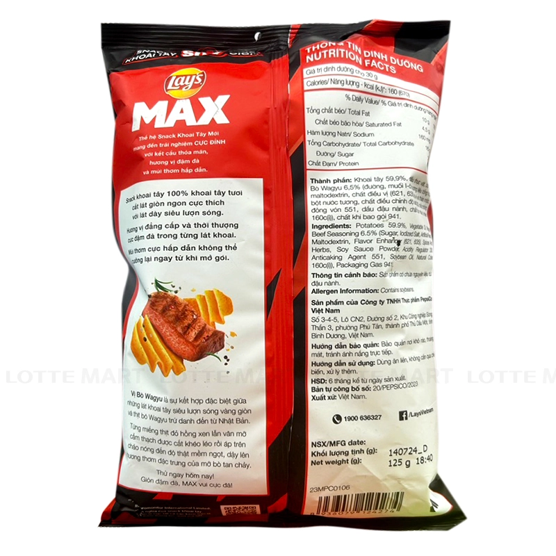 - Bánh có vị bò Wagyu trứ danh từ Nhật Bản tạo nên hương vị bùng nổ, lạ miệng, đậm đà trên từng miếng khoai tây. Sản phẩm đến từ thương hiệu Lay's uy tín và được sản xuất trên dây chuyền hiện đại, đảm bảo an toàn về sinh thực phẩm.