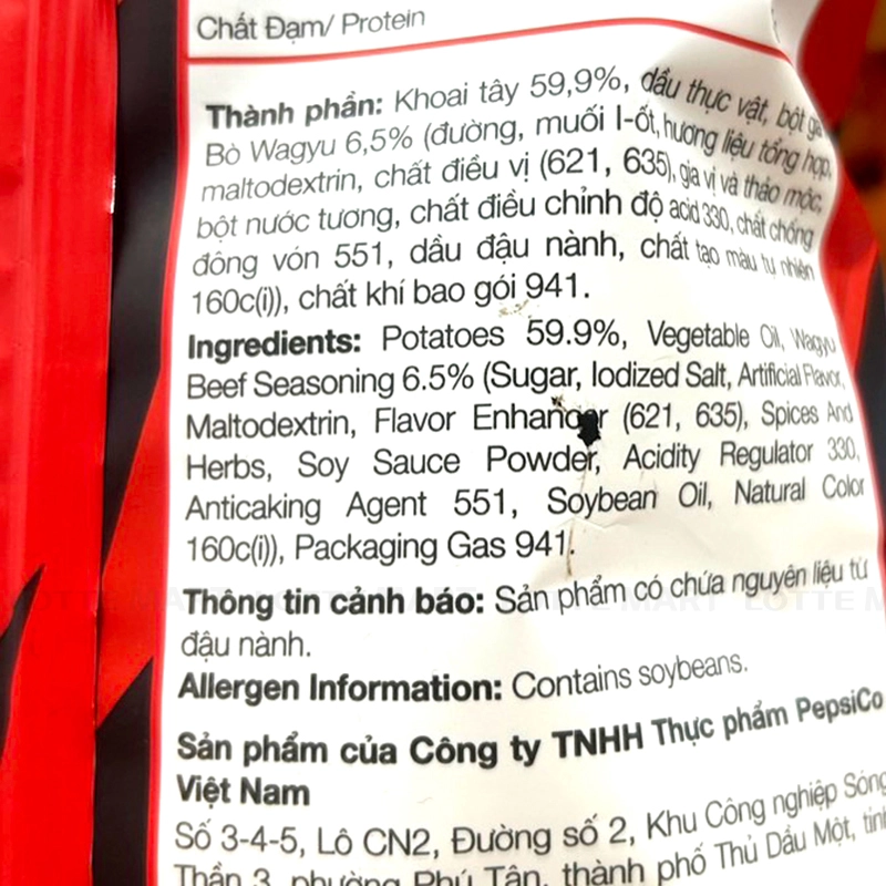 - Khoai tây 61.1%, dầu thực vật, bột gia vị Bò Wagyu 7% (đường, muối i - ốt, hương tổng hợp, maltodextrin, chất điều vị, gia vị và thảo mộc, bột nước tương, chất điều chỉnh độ chua, chất chống đông vón, dầu đậu nành, màu tự nhiên), khí đóng gói.