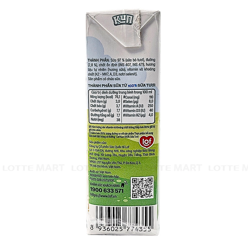 - Sữa Tươi Tiệt Trùng Ít Đường Lof Kun giúp bé cao lớn hơn và tăng cường sức đề kháng nhờ có chứa Vitamin K2, D3, A và các khoáng chất như Canxi, Selen,...