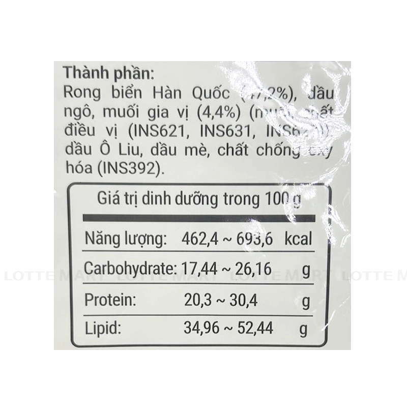 - Sản phẩm là rong biển sấy khô được tẩm ướp sẵn gia vị, thường được người Hàn dùng để ăn kèm với cơm trắng. Sản phẩm được chế biến dựa trên dây chuyền hiện đại của Hàn Quốc nhằm đảm bảo giữ nguyên giá trị dinh dưỡng.