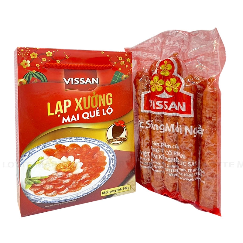 Lạp xưởng Mai Quế Lộ Vissan hộp 500g là món ăn truyền thống của người Việt Nam vào những dịp lễ tết, thích hợp tiêu dùng hoặc làm quà tặng. Sản phẩm được chế biến từ nguồn nguyên liệu đạt tiêu chuẩn VietGAp, thành phần chính là nạc heo và mỡ heo được xay nhuyễn phối trộn với gia vị và rượu Mai Quế Lộ đặc trưng của sản phẩm, nhồi vào vỏ bọc để định hình thành cây lạp xưởng, đem sấy ở nhiệt độ 60 đến 80 độ C. Thành phần: Nạc heo, mỡ heo, ruột collagen, đường, muối i-ốt, rượu Mai quế lộ (0,17%), chất làm ẩm (450i, 450ii, 450iii, 451i), chất điều chỉnh độ acid (262i), chất giữ màu (250), chất điều vị (621, 627, 631), chất chống oxy hóa (320, 321), phẩm màu tổng hợp (129). Sản phẩm có thể chiên, nướng hoặc hấp, ăn kèm với với cơm trắng, bánh mì, xôi... hoặc có thể chế biến thành các món ăn khác. Lạp xưởng được đựng trong bao hút chân không theo quy cách 500g/gói rồi cho vào hộp giấy theo quy cách 1 gói/hộp. Hướng dẫn bảo quản: Bảo quản ở điều kiện bình thường, nơi khô ráo và thoáng mát, tránh ánh nắng trực tiếp.
