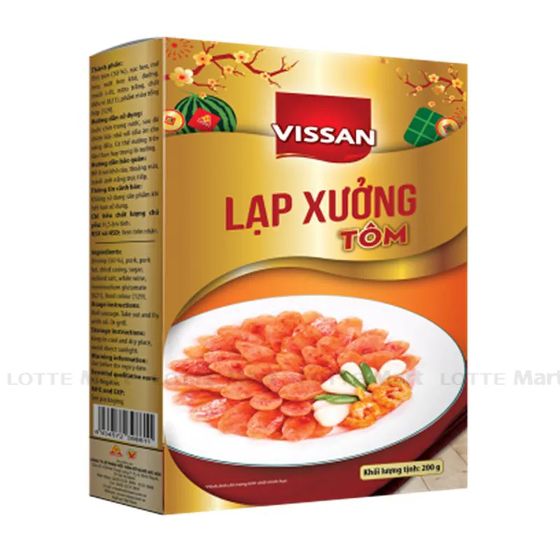 Lạp xưởng tôm Vissan hộp 200g có hương vị truyền thống, mùi vị tôm đặc trưng, thêm sự lựa chọn cho người tiêu dùng về chủng loại. Sản phẩm đảm bảo ảm bảo vệ sinh an toàn thực phẩm của Ban quản lý ATTP Tp.HCM. Thành phần: Thịt tôm (50%), nạc heo, mỡ heo, ruột heo khô, đường, muối i-ốt, rượu trắng, chất điều vị (621), phẩm màu tổng hợp (129). Thiết kế đóng gói nhỏ gọn, tiện lợi, thích hợp dùng làm quà tặng cho bạn bè, người thân trong các dịp lễ, tết.