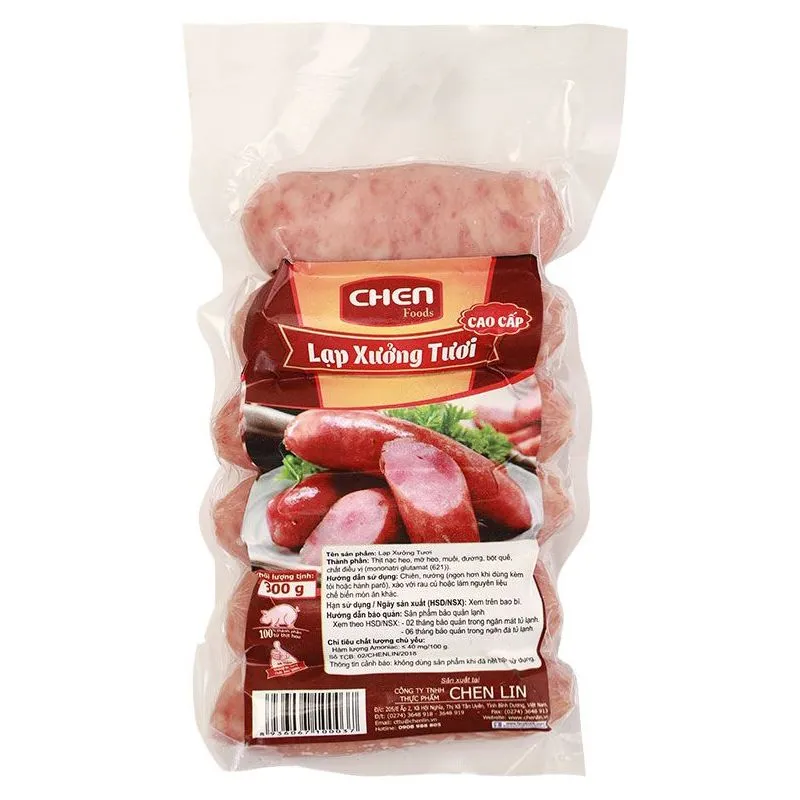 Lạp Xưởng Tươi Chenlin tươi, mềm, béo thơm đặc trưng, đặc biệt nhiều nạc, ít mỡ, ăn không ngán. Lạp xưởng được sử dụng để chế biến nhiều món ăn hấp dẫn cho gia đình, hợp khẩu vị với đại đa số người Việt, nhất là người miền Bắc. Lạp xưởng được đóng gói, bảo quản trong túi chân không, đảm bảo an toàn, hợp vệ sinh. Nguyên liệu chính trong lạp xưởng là thịt heo nên sử dụng lạp xưởng cũng đồng nghĩa với việc cung cấp cho cơ thể bạn một nguồn dưỡng chất giống với thịt heo. Trong lạp xưởng có chứa các chất như Lipid, Protid, canxi, vitamin… Ăn một lượng lạp xưởng vừa đủ sẽ giúp cơ thể bổ sung năng lượng hiệu quả. Đặc biệt, lạp xưởng không chứa phẩm màu hay chất bảo quản. Thành phần: Thịt nạc heo, mỡ heo, muối, đường, bột quế, chất điều vị (mononatri glutamat (621)).