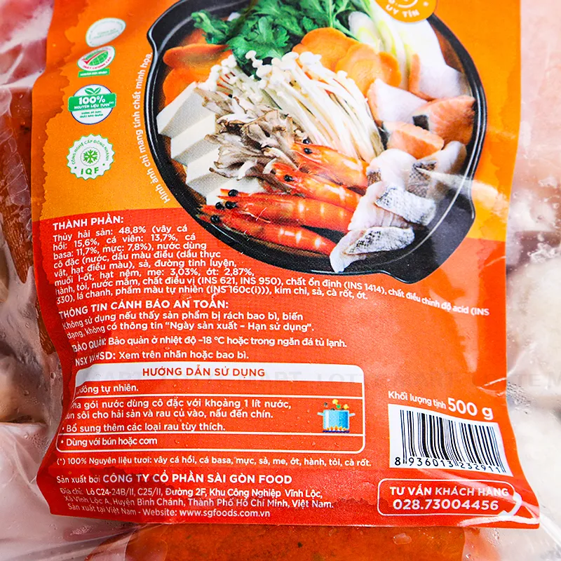 Thành phần: Hải sản > 46%(Cá, Chả cá, Tôm, Mực, Bạch tuộc). Gói nước dùng cô đặc(Nước hầm xương cá hồi, me, đường, hành, tỏi, sả, dầu đậu nành, muối, hạt nêm, ớt, nước).