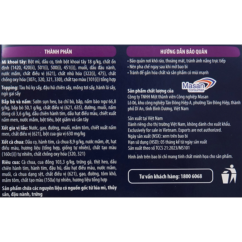 - Sợi mì được làm từ trứng và sợi khoai tây kết hợp nhiệt độ chiên thích hợp cho ra sợi mì dai mướt, thấm vị. Nước dùng có vị chua nhẹ từ cà chua tự nhiên, nhưng hậu vị vẫn ngọt lành, kết hợp cùng với topping thịt bò thơm mềm và riêu cua làm từ 100% gạch cua nguyên chất, mang đến hương vị lôi cuốn, nước dùng đậm vị đặc trưng khó cưỡng.