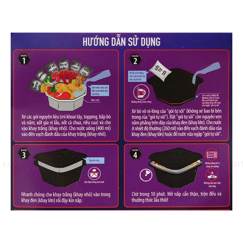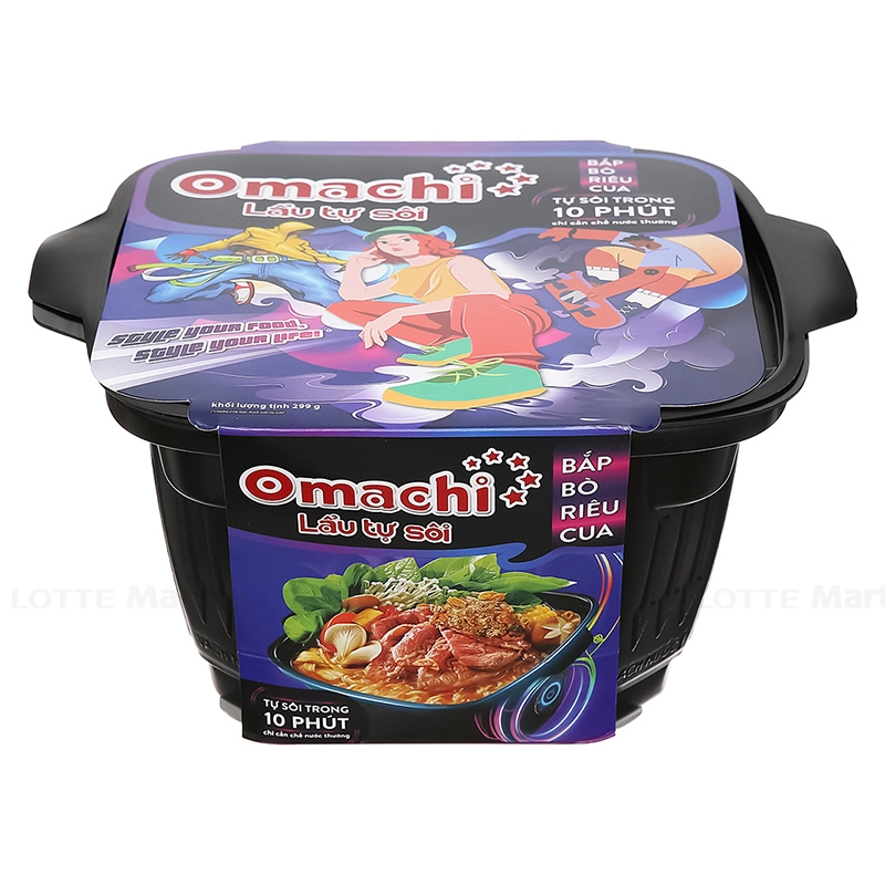 - Lẩu Tự Sôi Omachi Bắp Bò Riêu Cua đột phá với công nghệ tự nấu sôi trong 10 phút chỉ cần nước thường, chuẩn vị lẩu Việt, đầy rau đủ thịt, tươi ngon như món lẩu hàng quán, giúp bạn thưởng thức lẩu bất cứ nơi đâu mà không cần phải tốn nhiều thời gian, công sức.