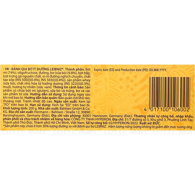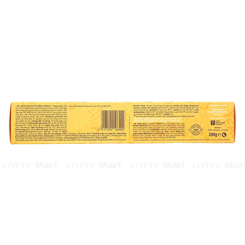 Bánh Quy Bơ Ít Đường Bahlsen Leibniz là một sản phẩm nhập khẩu từ Đức. Với quy trình sản xuất nghiêm ngặt, từ những nguyên liệu tự nhiên, sản phẩm được tạo ra hoàn toàn không có chất bảo quản, an toàn cho sức khỏe. Nguyên liệu an toàn kết hợp cùng công thức chế biến riêng biệt cho ra sản phẩm đạt chất lượng cao.