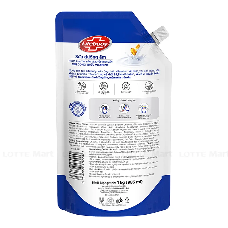 - Nước Rửa Tay Lifebuoy Diệt Khuẩn Dưỡng Ẩm Chăm Sóc Da sử dụng công thức cải tiến rất mới với công thức Vitamin+ bao gồm Vitamin B3, C & E giúp hỗ trợ đề kháng da tự nhiên.